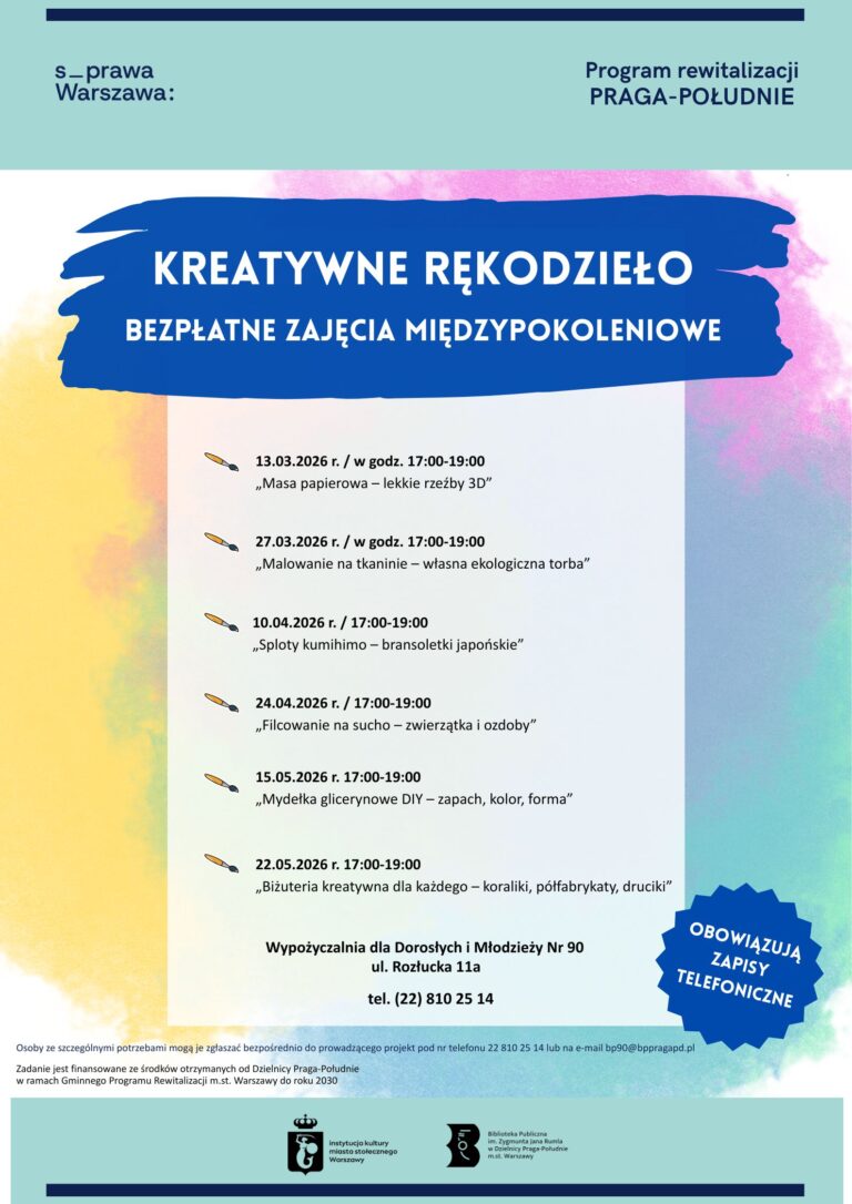 Zapraszamy na kolejne warsztaty międzypokoleniowe z cyklu „Kreatywne rękodzieło” do Wypożyczalni dla Dorosłych i Młodzieży nr 90 przy ul. Rozłuckiej 11a. To wyjątkowa okazja do wspólnego tworzenia i rozwijania pasji artystycznych bez względu na wiek. Uczestnicy poznają technikę filcowania na sucho i własnoręcznie wykonają dekoracje oraz figurki zwierząt. Obowiązują zapisy: tel. 22 810 25 14 […]