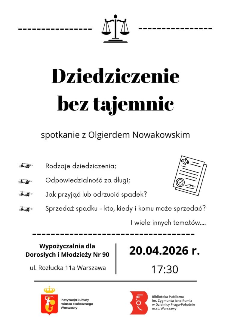 Masz pytania dotyczące spadków? Chcesz dowiedzieć się, jak uniknąć problemów związanych z dziedziczeniem? Już 20 kwietnia o 17:30 zapraszamy na spotkanie z Olgierdem Nowakowskim, podczas którego omówimy m.in.:✔️ rodzaje dziedziczenia✔️ odpowiedzialność za długi spadkowe✔️ przyjęcie lub odrzucenie spadku✔️ sprzedaż spadku – zasady i możliwości 📍 Wypożyczalnia dla Dorosłych i Młodzieży Nr 90 ul. Rozłucka 11a […]