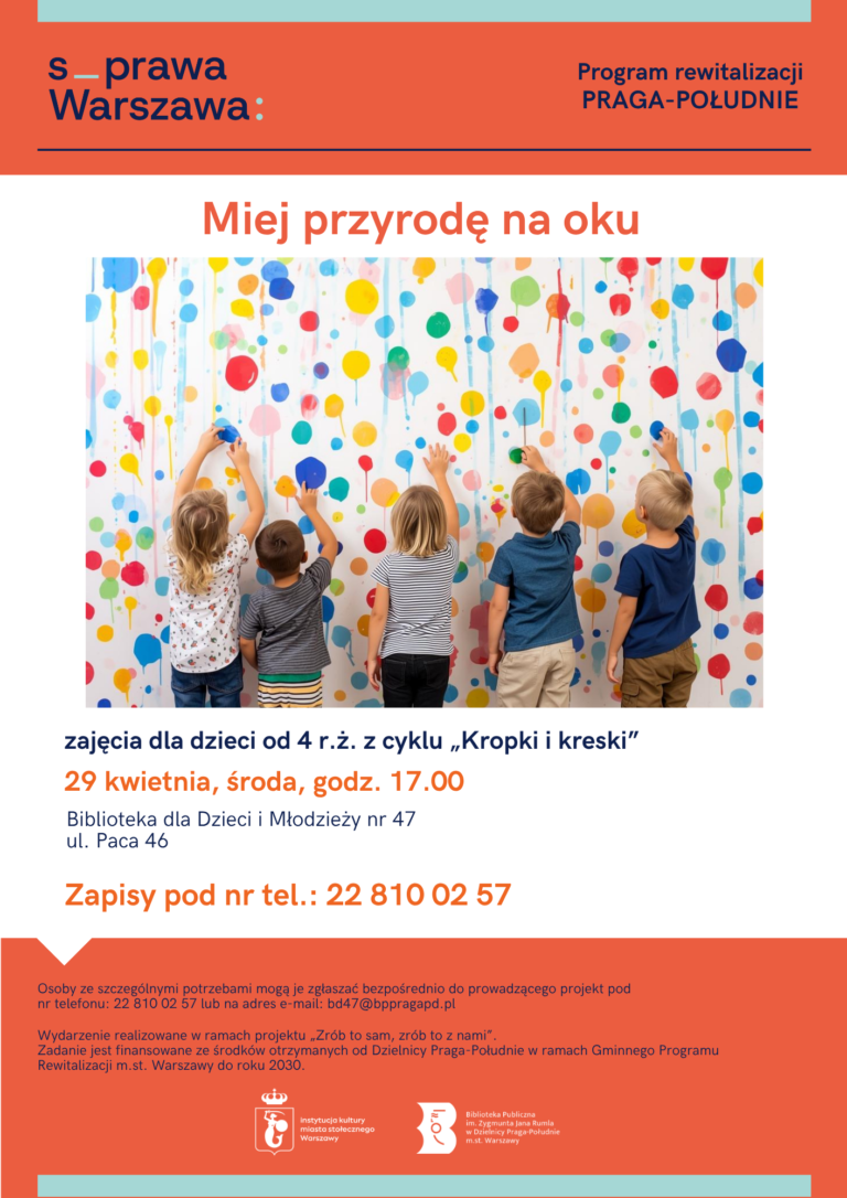 Zapraszamy na zajęcia dla dzieci od 4 r.ż. z cyklu „Kropki i kreski”. Obowiązują zapisy: tel. 22 810 02 57 Miejsce: Biblioteka dla Dzieci i Młodzieży nr 47, ul. Paca 46 Wydarzenie realizowane w ramach projektu „Zrób to sam, zrób to z nami”. Zadanie jest finansowane ze środków otrzymanych od Dzielnicy Praga-Południe w ramach Gminnego […]