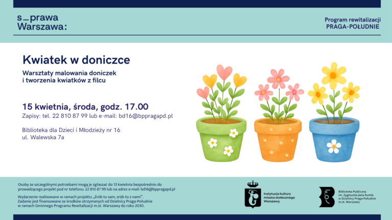 Kwiatek w doniczce – kreatywne warsztaty dla dzieci! Zapraszamy na wiosenne, pełne kolorów warsztaty, podczas których mali uczestnicy stworzą coś naprawdę wyjątkowego! 🖌W trakcie zajęć dzieci własnoręcznie pomalują ceramiczne doniczki, a następnie wykonają uroczy kwiatek z miękkiego filcu. Powstaną piękne, kolorowe kompozycje, które będą nie tylko wiosenną ozdobą, ale też wyjątkową pamiątką z warsztatów.To zajęcia, […]