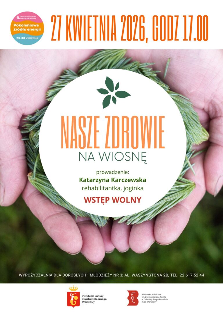 Spotkanie z Katarzyną Karczewską, rehabilitantką i joginką w ramach Warszawskiego Tygodnia Międzypokoleniowego 23-30.04. Wstęp wolny Miejsce: Wypożyczalnia dla Dorosłych i Młodzieży nr 3, ul. Waszyngtona 2b