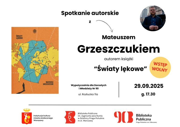 Wypożyczalnia dla Dorosłych i Młodzieży nr 90, mieszcząca się przy ul. Rozłuckiej 11a, zapraszamy w poniedziałek 29 września o godz. 17:00 na spotkanie z Mateuszem Grzeszczukiem, autorem książki „Światy lękowe”. Nota wydawcy: „Światy Lękowe” to przewrotny dziennik czasów przebodźcowania. W obliczu chaosu współczesnego życia, odnalezienie równowagi między pracą, relacjami a własnym ja staję się fundamentalnym […]