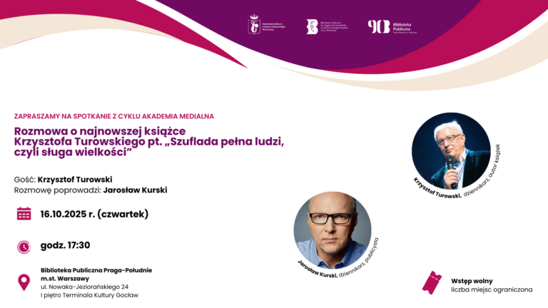 Gorąco zachęcamy do udziału w kolejnym spotkaniu z cyklu „Akademia medialna”. Tym razem we czwartek 16 października o godz. 17:30 gospodarz cyklu -Krzysztof Turowski, wcieli się w rolę gościa i opowie o swojej najnowszej książce, pt. „Szuflada pełna ludzi, czyli sługa wielkości”. Rozmowę poprowadzi dziennikarz i publicysta Jarosław Kurski.