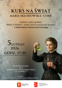 Chcesz poznać biografię jednej z najsłynniejszych Polek, wybitnej przedstawicielki świata nauki, dwukrotnej laureatki Nagrody Nobla? Koniecznie odwiedź Wypożyczalnię dla Dorosłych i Młodzieży nr 62 (ul. Egipska 7) i weź udział w spotkaniu z cyklu „Kurs na świat” – „Made in Poland – ludzie, którzy przesunęli granice”. Spotkanie poprowadzi historyk Katarzyna Ciemięga.