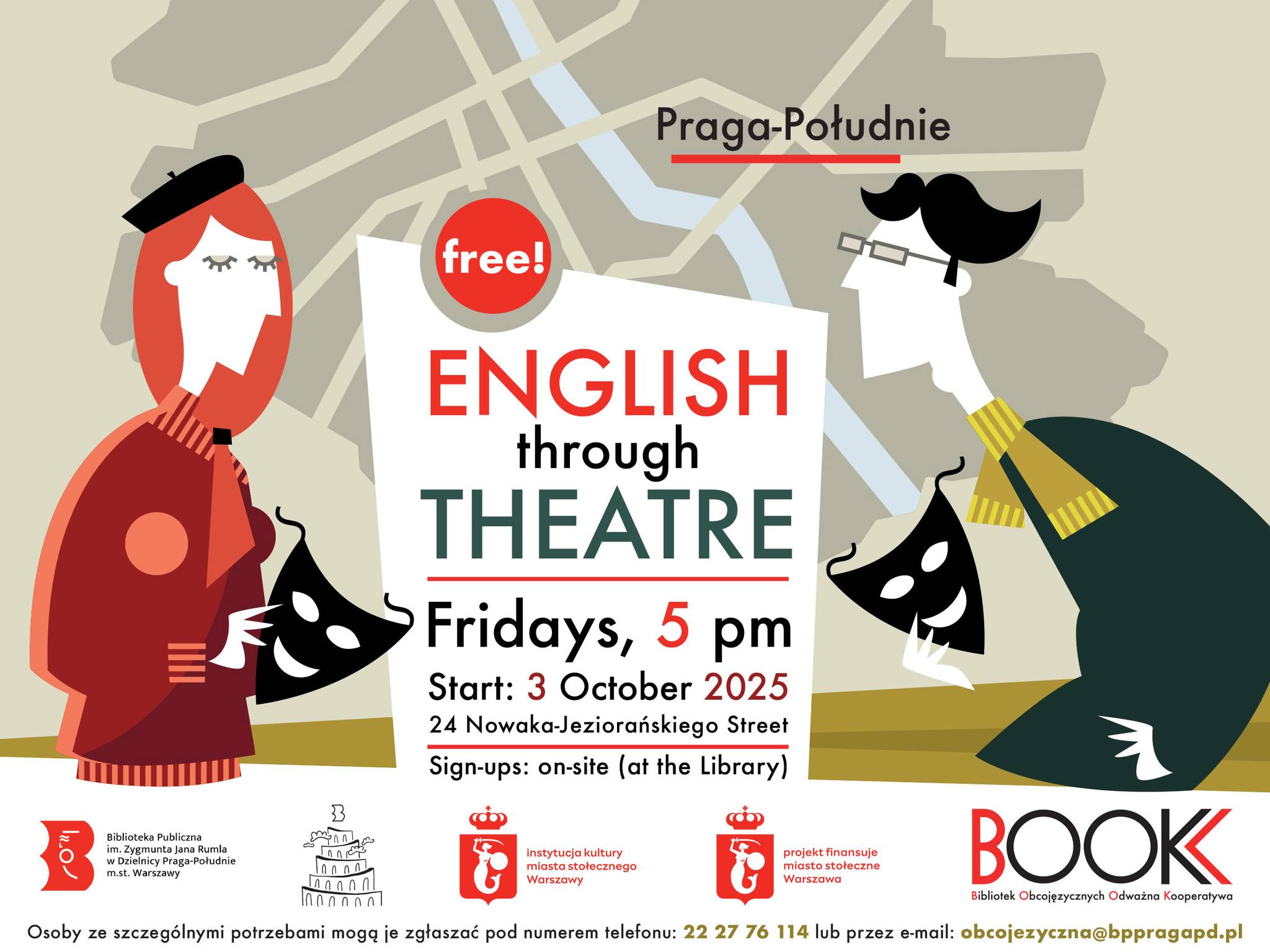 Zapraszamy na darmowe warsztaty teatralno-językowe dla wszystkich, którzy chcieliby lepiej i odważniej mówić po angielsku – nie tylko na scenie! W programie: czytanie performatywne, ćwiczenia artykulacyjne i odrobina improwizacji. Wcześniejsze doświadczenie aktorskie nie jest wymagane – wystarczy otwartość i kreatywna energia.