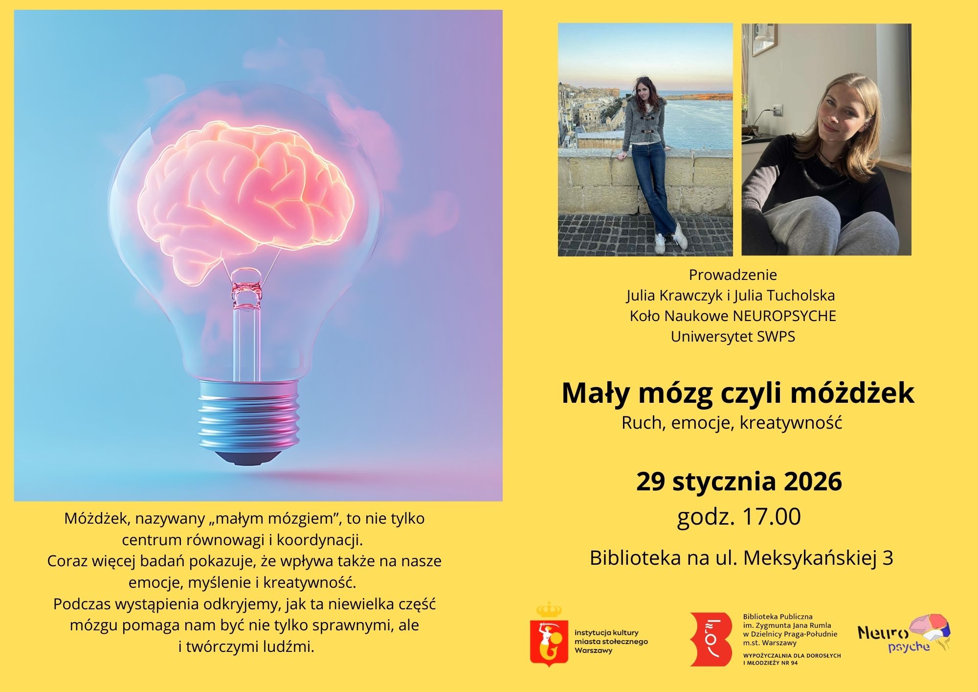 Wypożyczalnia dla Dorosłych i Młodzieży nr 94, mieszcząca się przy ul. Meksykańskiej 3, zaprasza na spotkanie „Mały mózg, czyli móżdżek – ruch, emocje, kreatywność”, które poprowadzą: Julia Krawczyk i Julia Tucholska, przedstawicielki Koła Naukowego NEUROPSYCHE z Uniwersytetu SWPS.