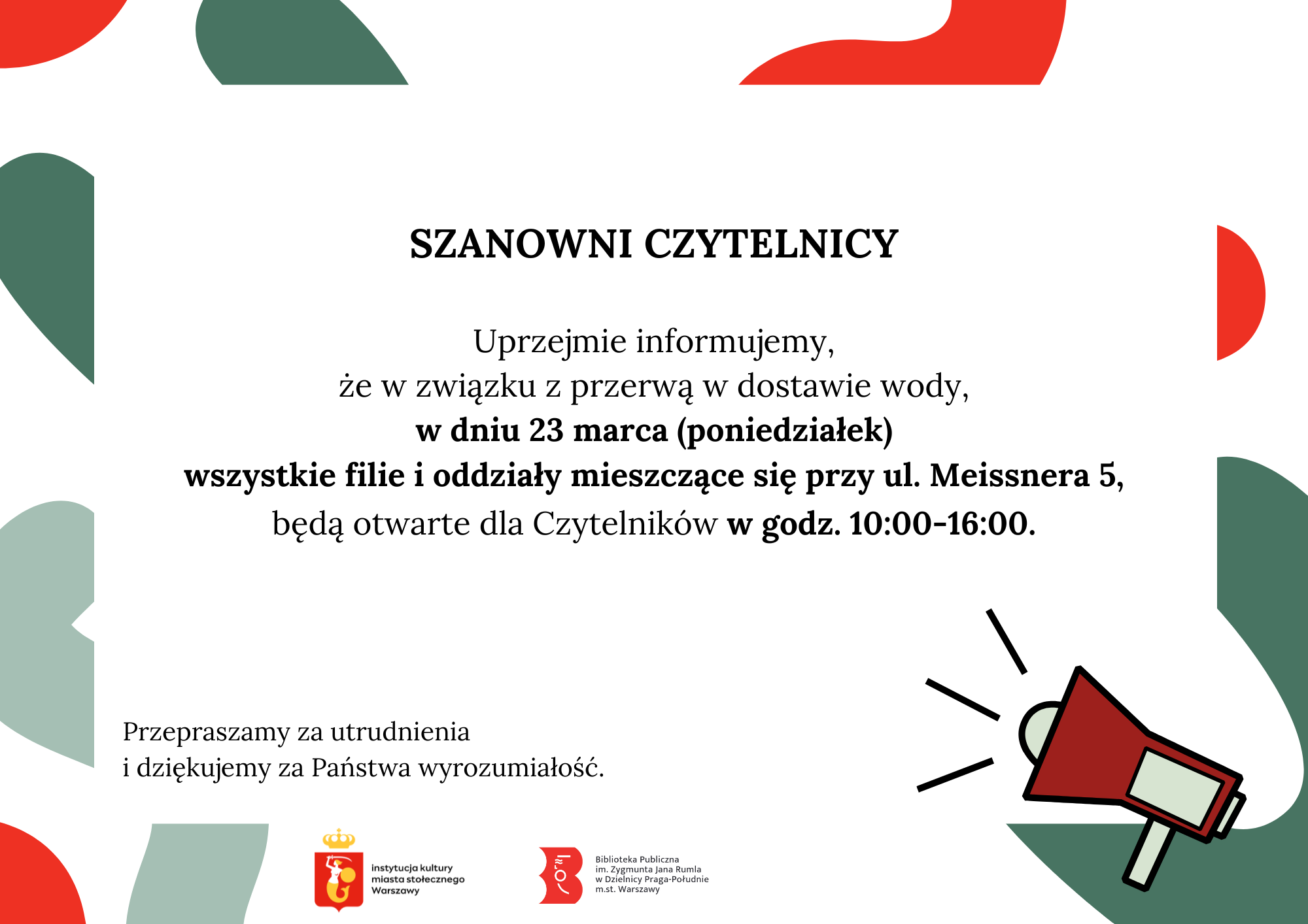 Drodzy Czytelnicy, informujemy że w najbliższy poniedziałek, 23 marca, filie i oddziały biblioteki zlokalizowane przy ul. Meissnera 5, będą otwarte dla Państwa w godz. 10:00-16:00. Zmiana podyktowana jest przerwą w dostawie wody. Przepraszamy za utrudnienia.