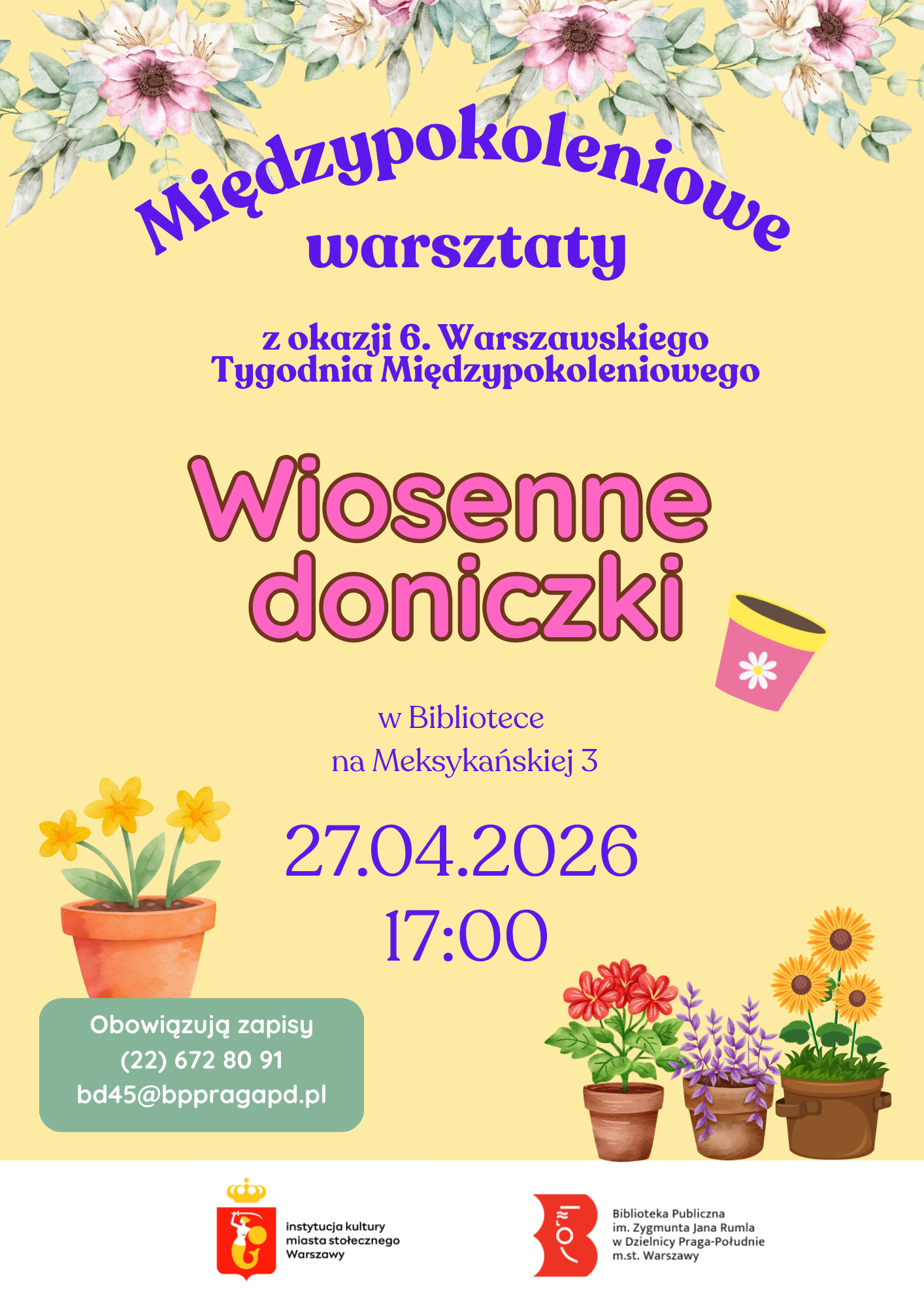 Poczuj wiosnę i stwórz własną, niepowtarzalną doniczkę pełną kolorów i zieleni podczas warsztatów międzypokoleniowych „Wiosenne doniczki”. To radosne, twórcze spotkanie, które łączy pokolenia i pozwala wspólnie celebrować budzącą się do życia naturę. Uczestnicy w swoich doniczkach umieszczą sadzonki kwiatów.
