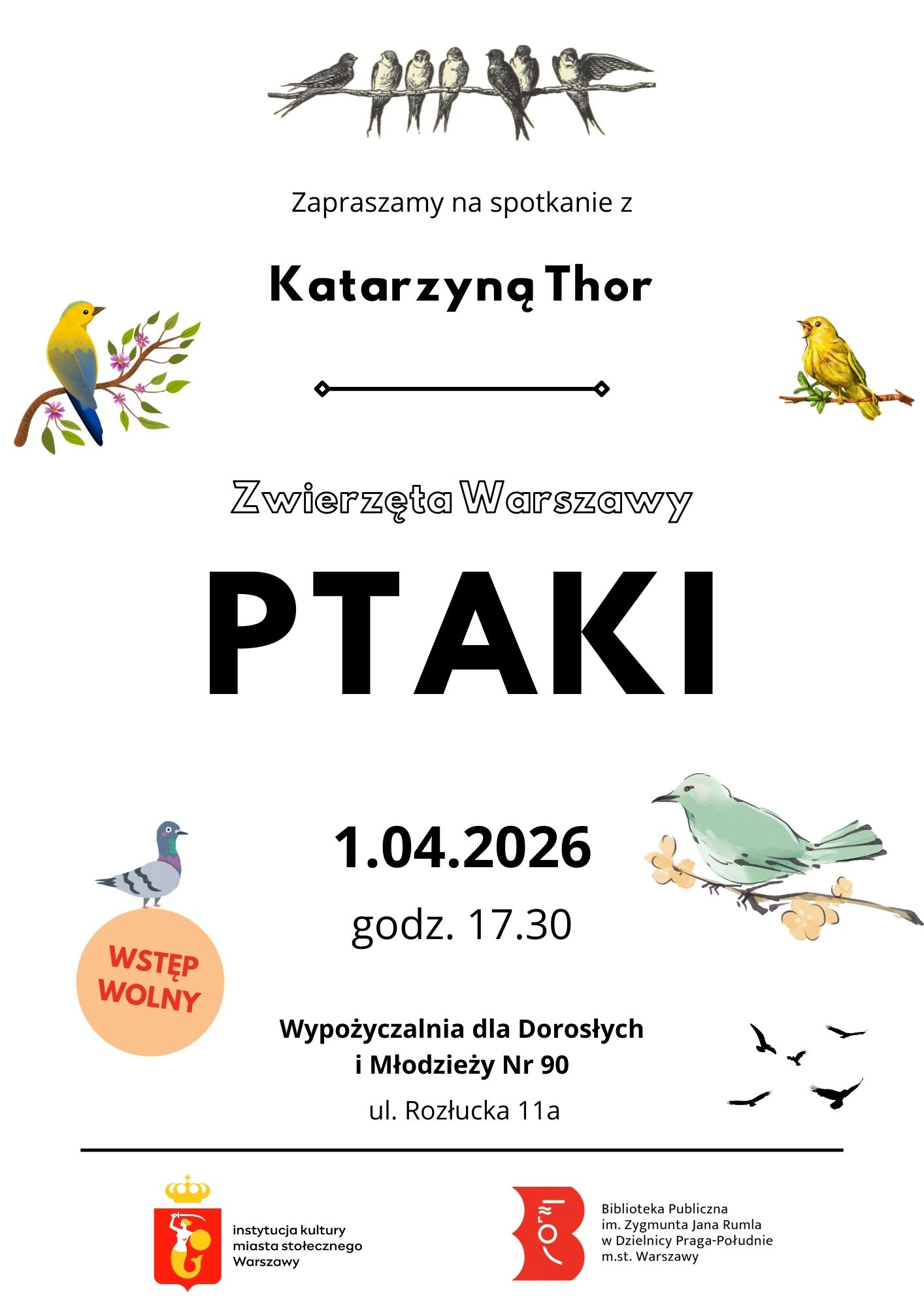 Zapraszamy na spotkanie z cyklu „Zwierzęta Warszawy”, podczas którego wspólnie z prowadzącą Katarzyną Thor będziemy odkrywać fascynujący świat skrzydlatych mieszkańców stolicy. Poznamy ich zwyczaje, nauczymy się je rozpoznawać i zobaczymy Warszawę z zupełnie nowej perspektywy!