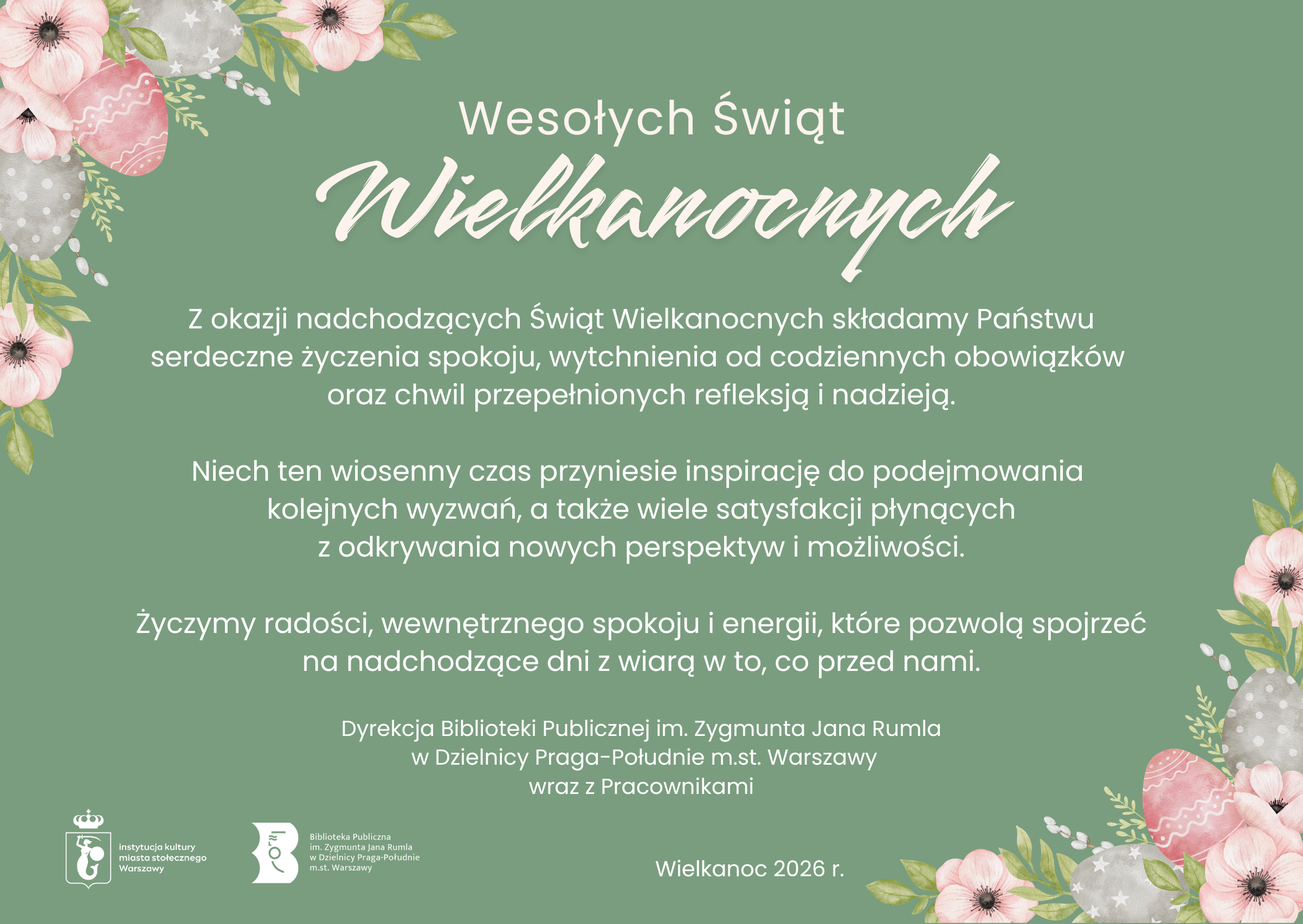 z okazji nadchodzących Świąt Wielkanocnych składamy Państwu serdeczne życzenia spokoju, wytchnienia od codziennych obowiązków oraz chwil przepełnionych refleksją i nadzieją ![]()
